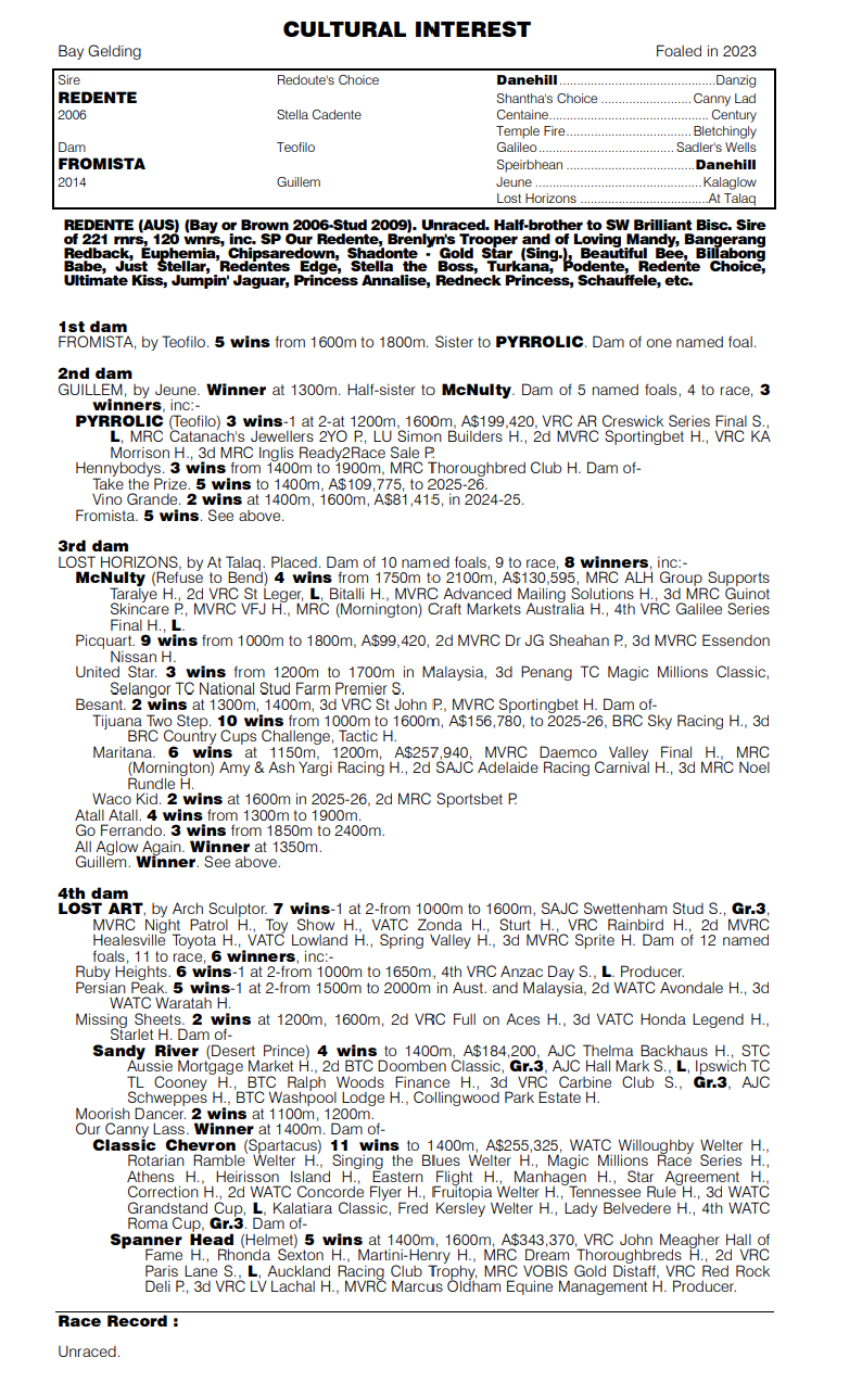 Cultural Interest 2 Year Old Bay Colt ProfilePedigreeEnquire Sire: Redente Colour: Bay Dam: Fromista Sex: Colt Age: 2 Foaled: Nov 18, 2023 Country: Australia First Name (required) Last Name (required) Your Email (required) Phone Message Hello, I'd like to know more regarding the horse Cultural Interest you have listed as available. Send Δ